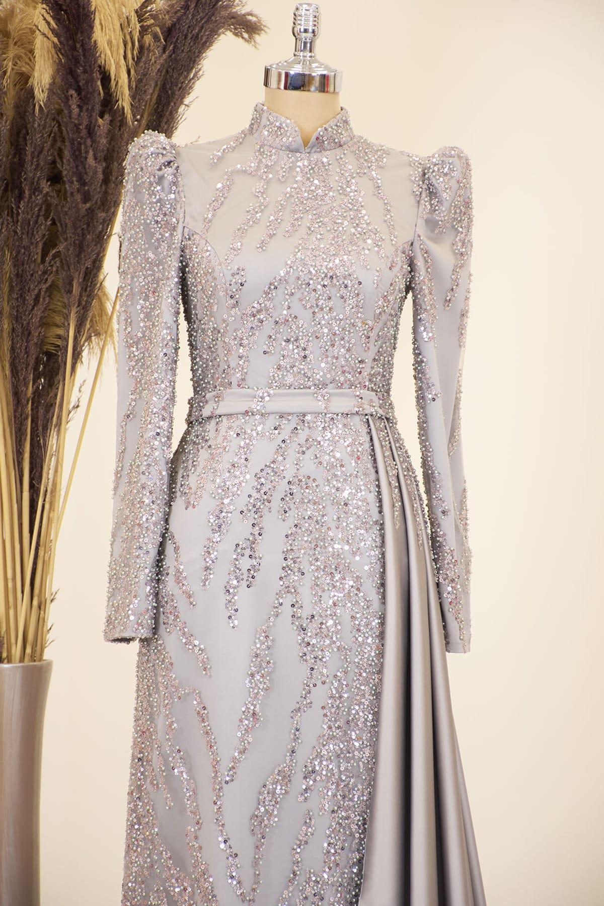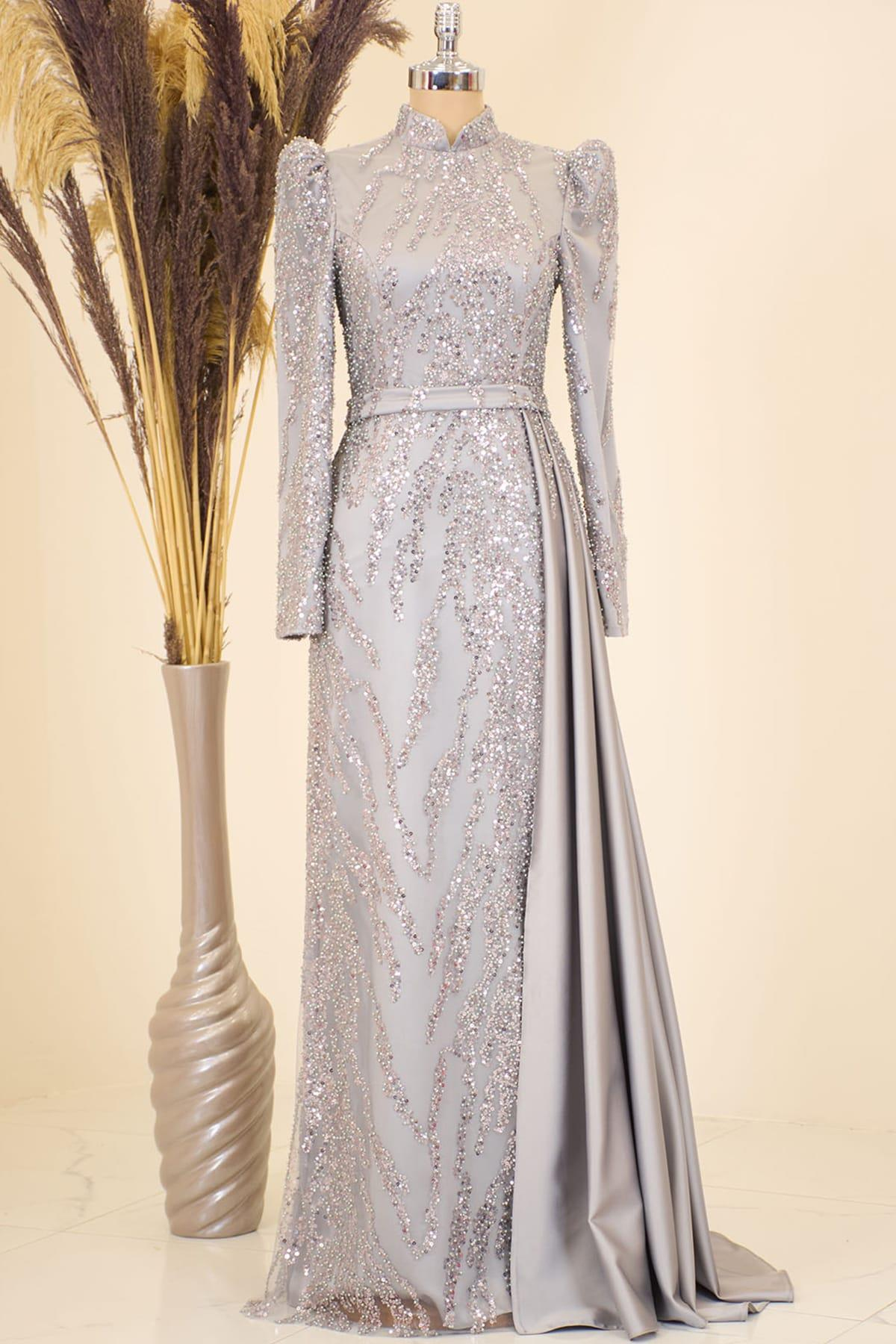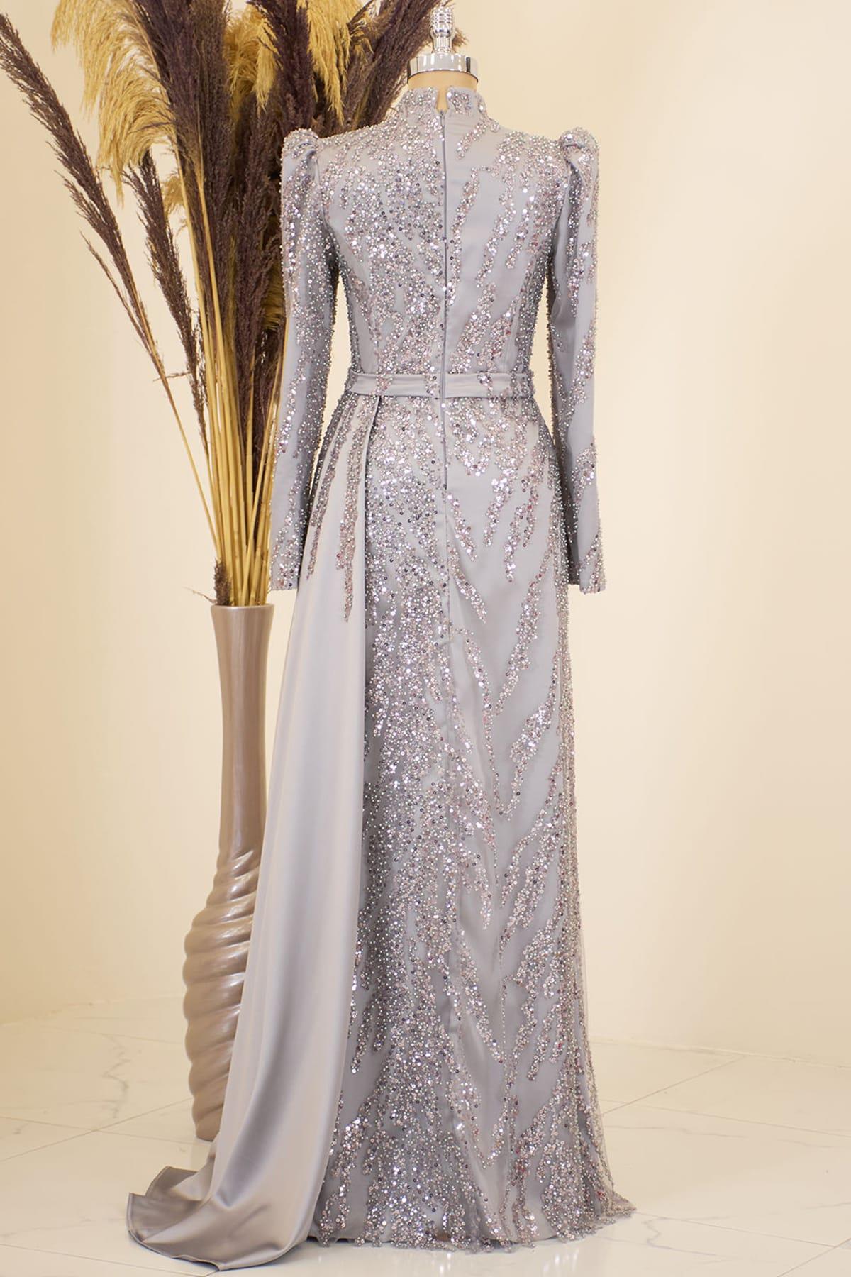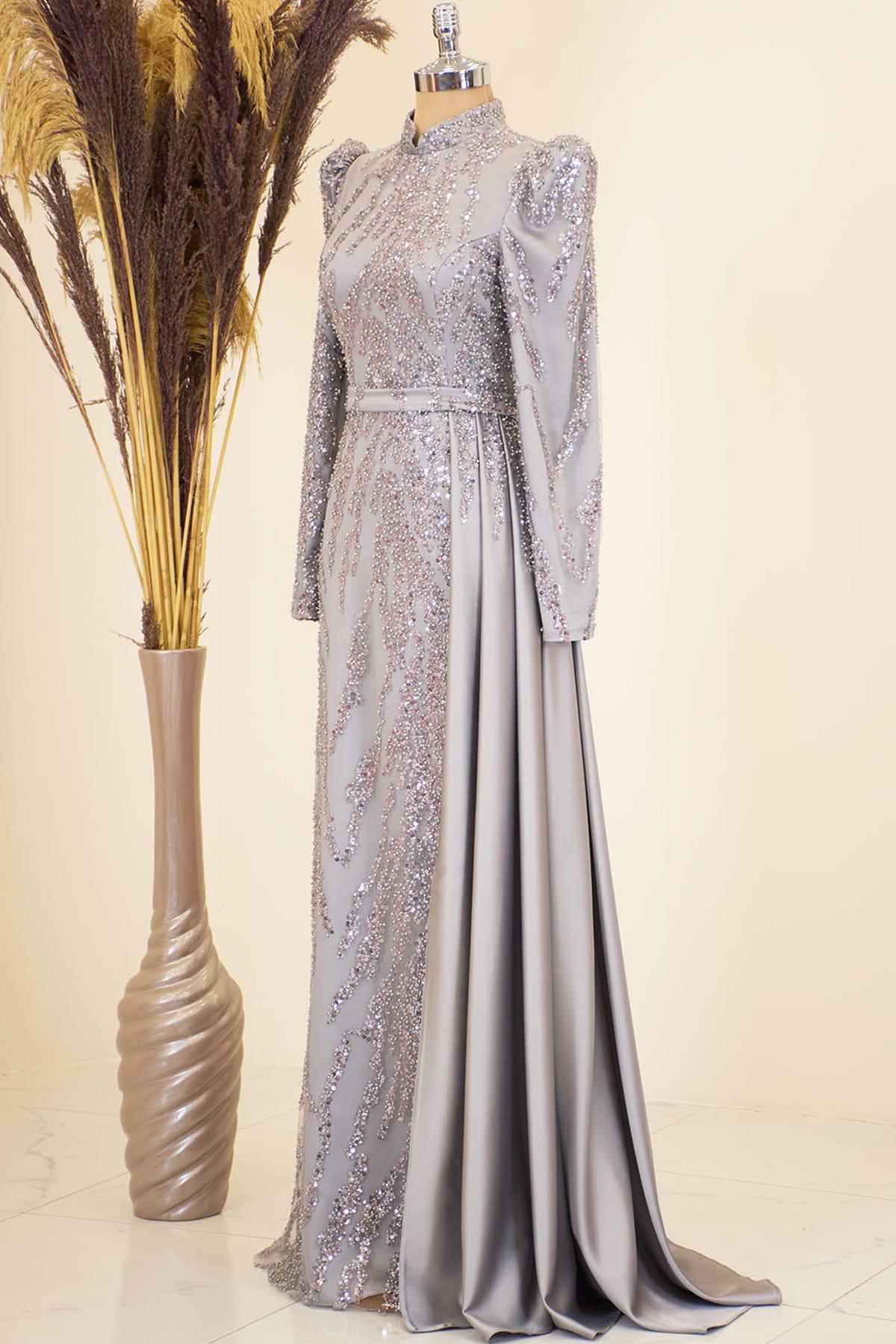 Eteği Sarkaçlı Boncuk İşlemeli Saten Seçil Tesettür Abiye Gri