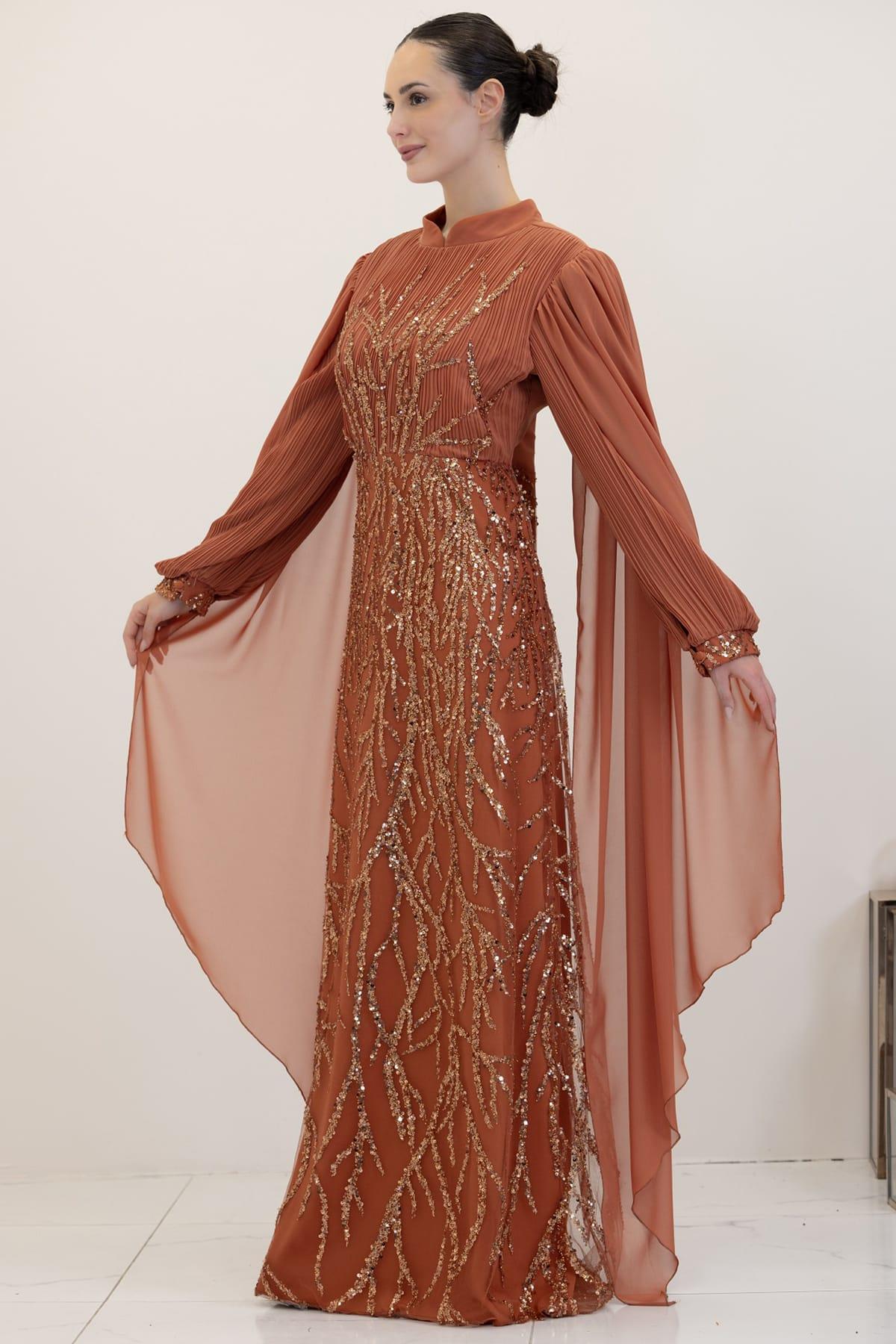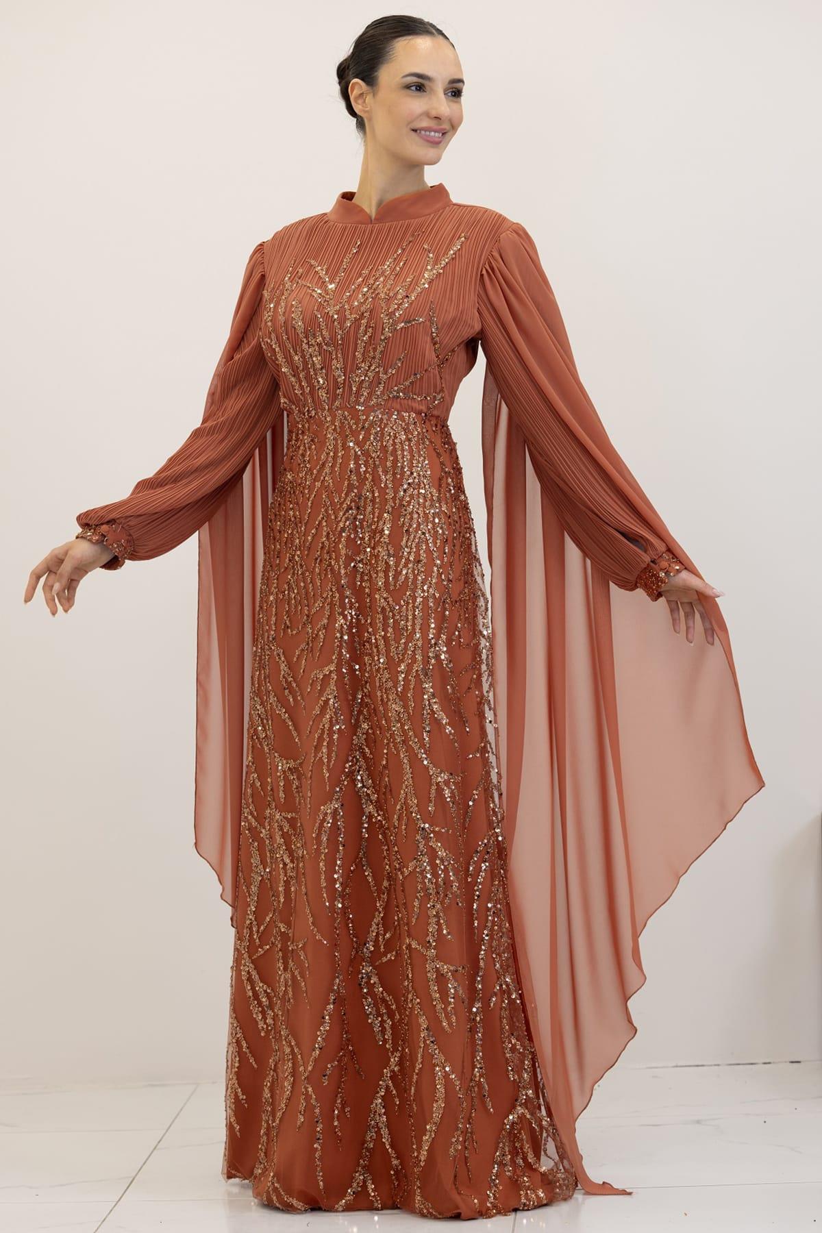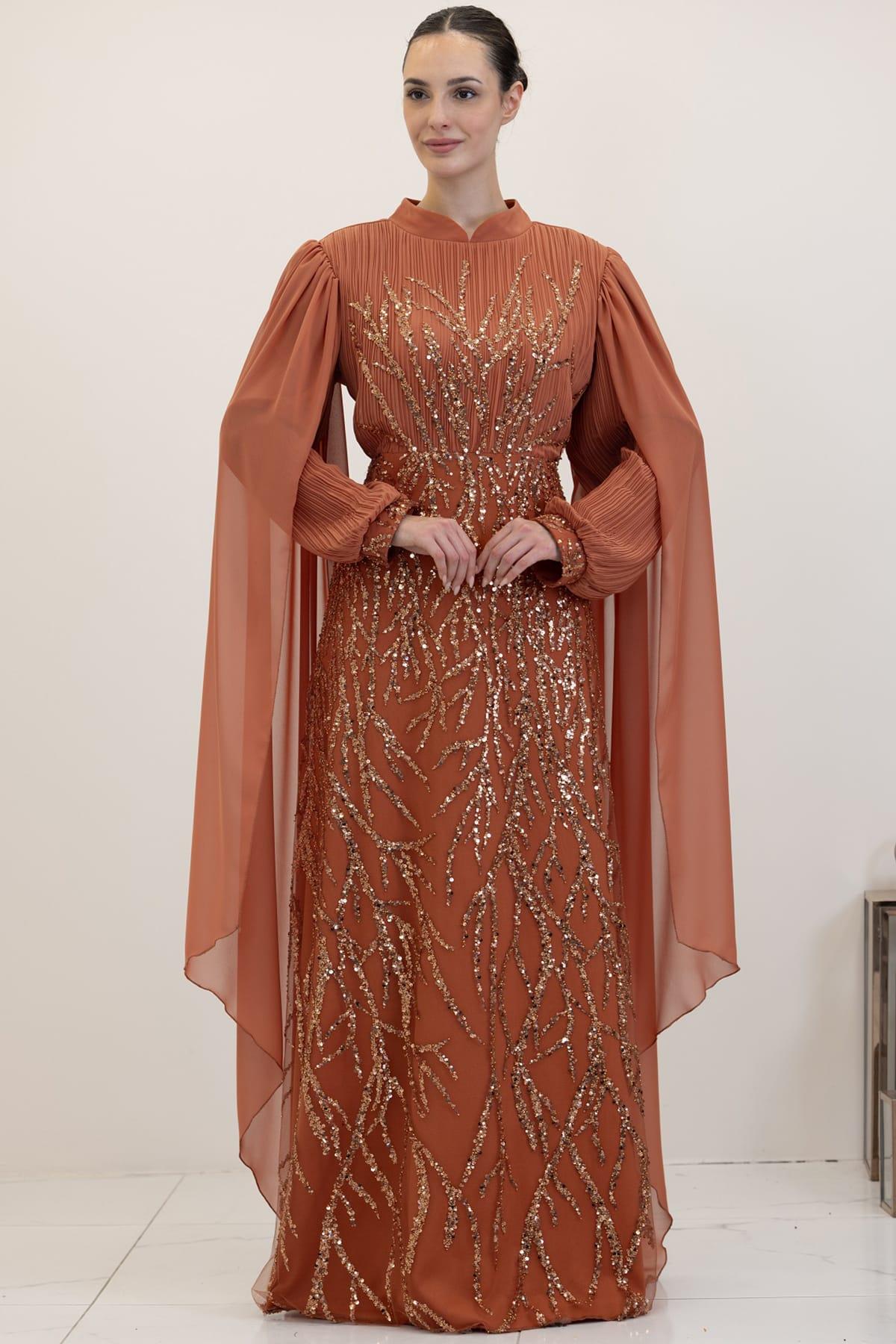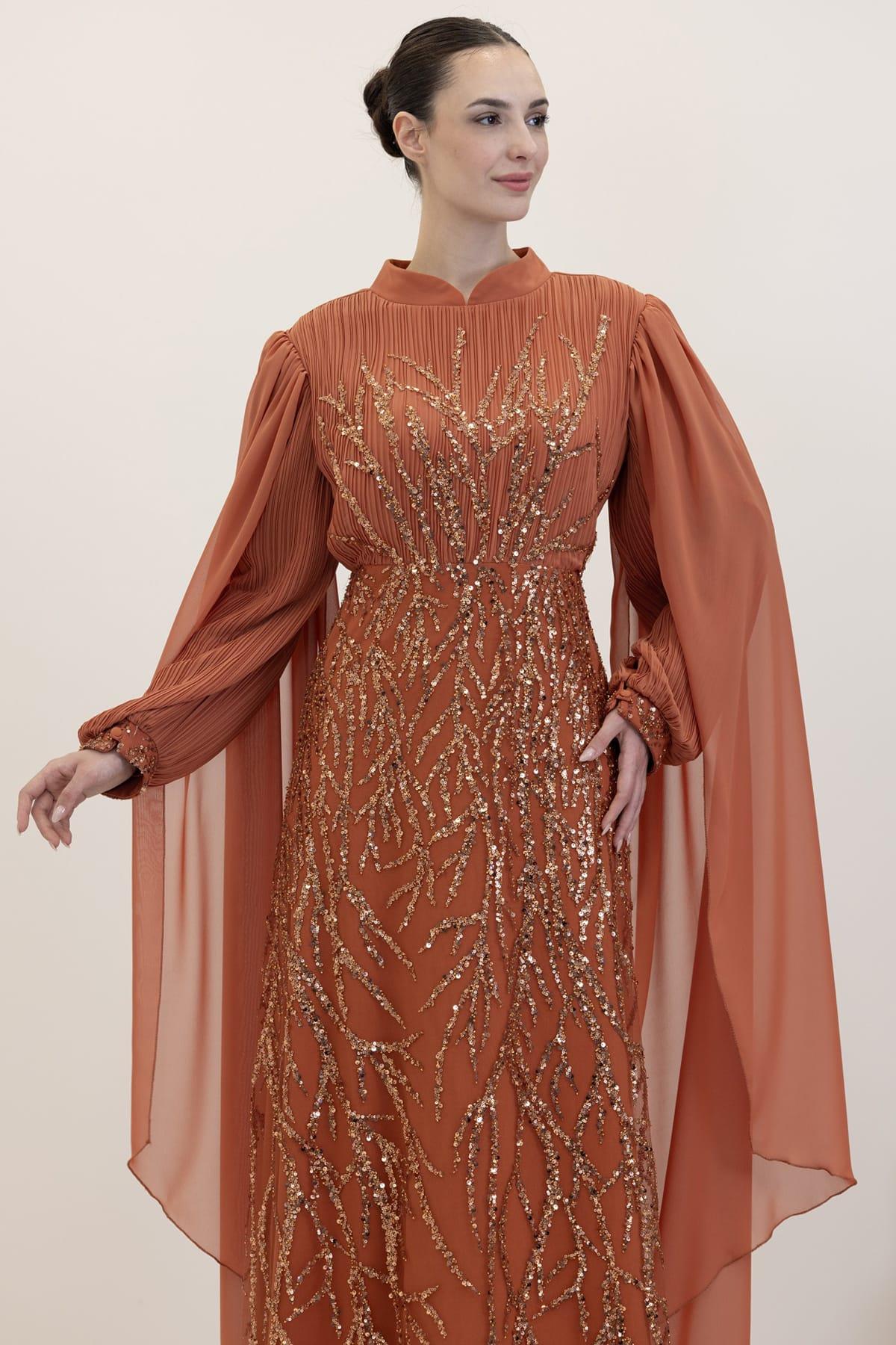 Kolları Pelerinli Ezgi Tesettür Abiye Kiremit