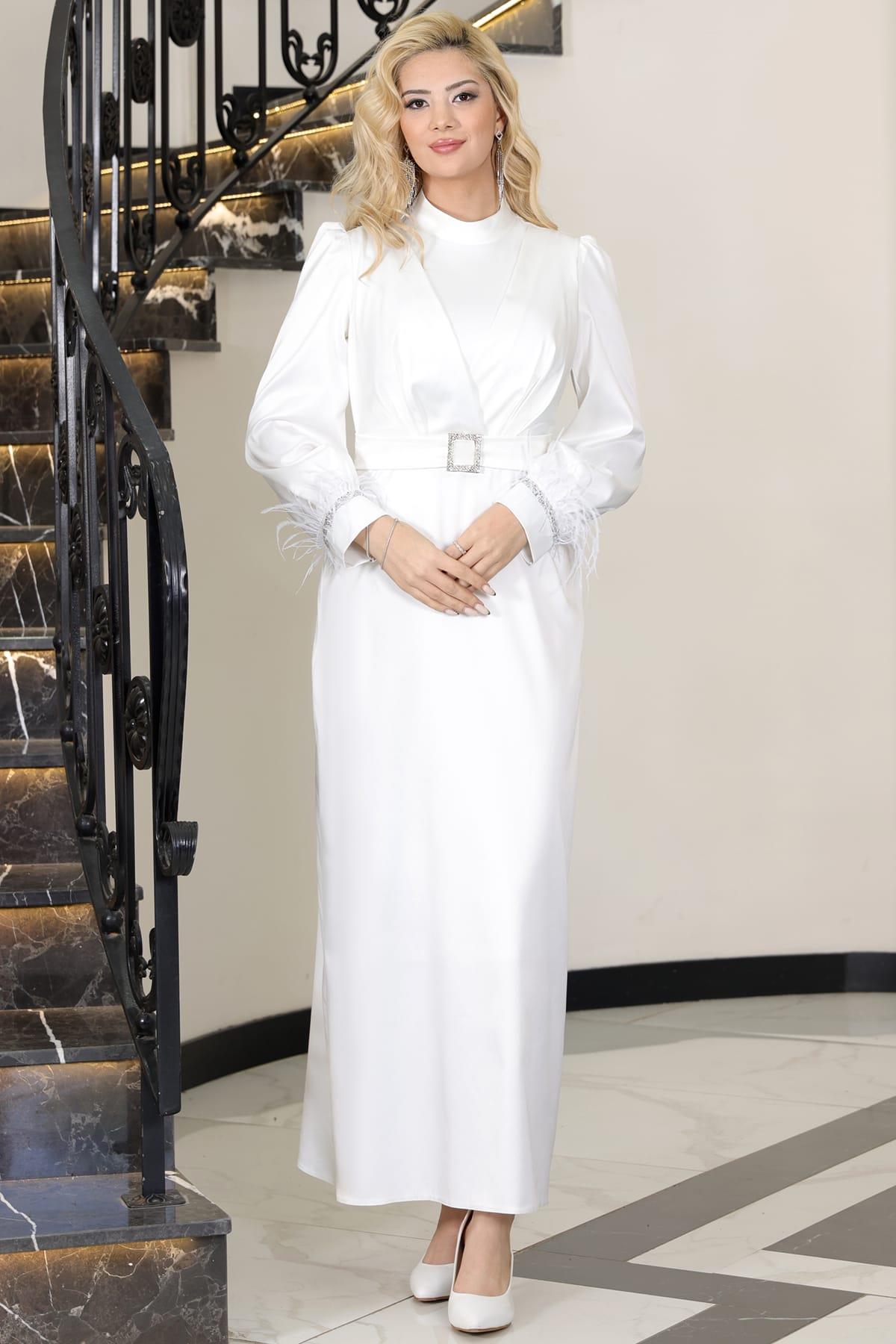Lara Kemerli Saten Tesettür Abiye Beyaz