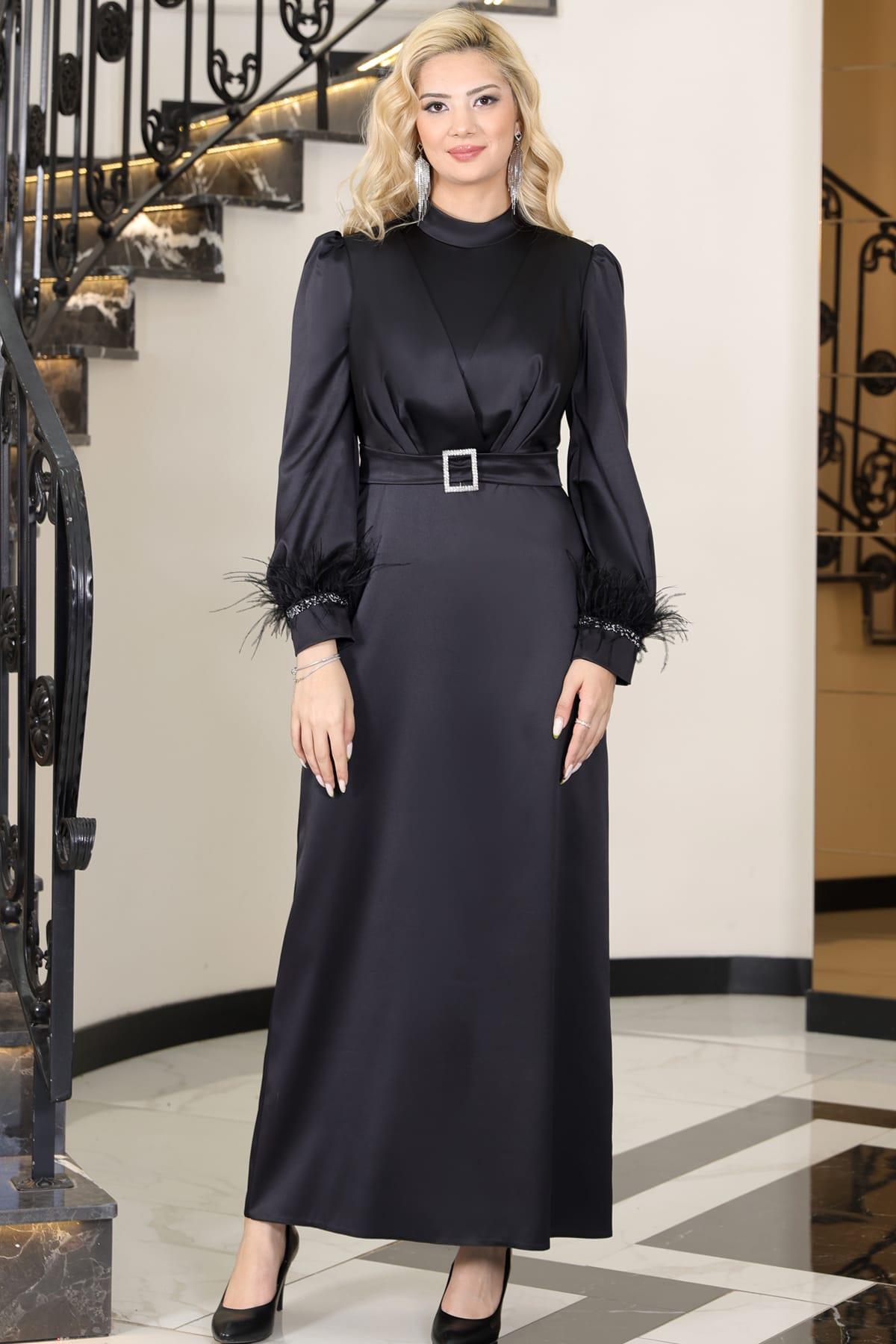 Lara Kemerli Saten Tesettür Abiye Siyah