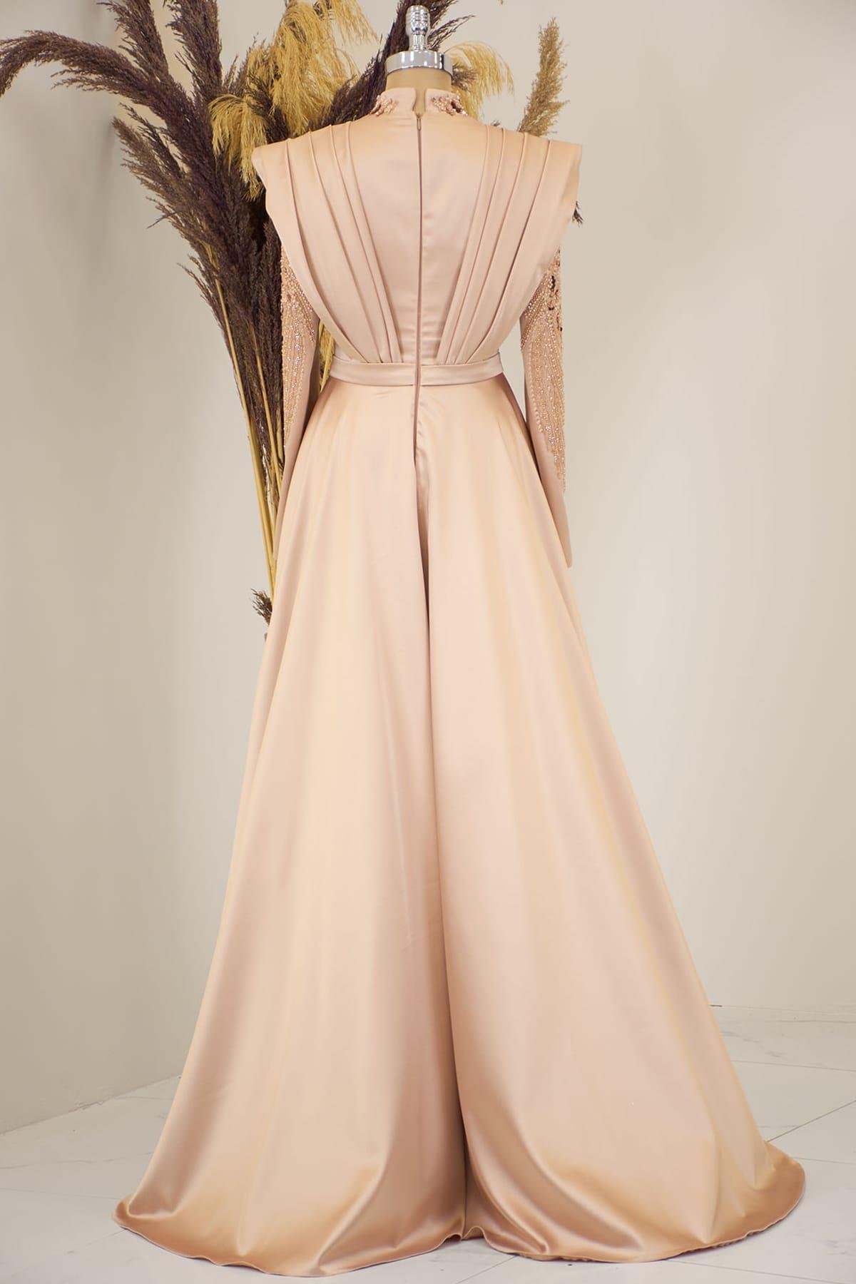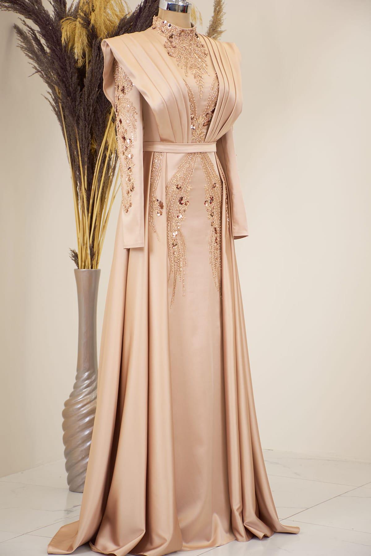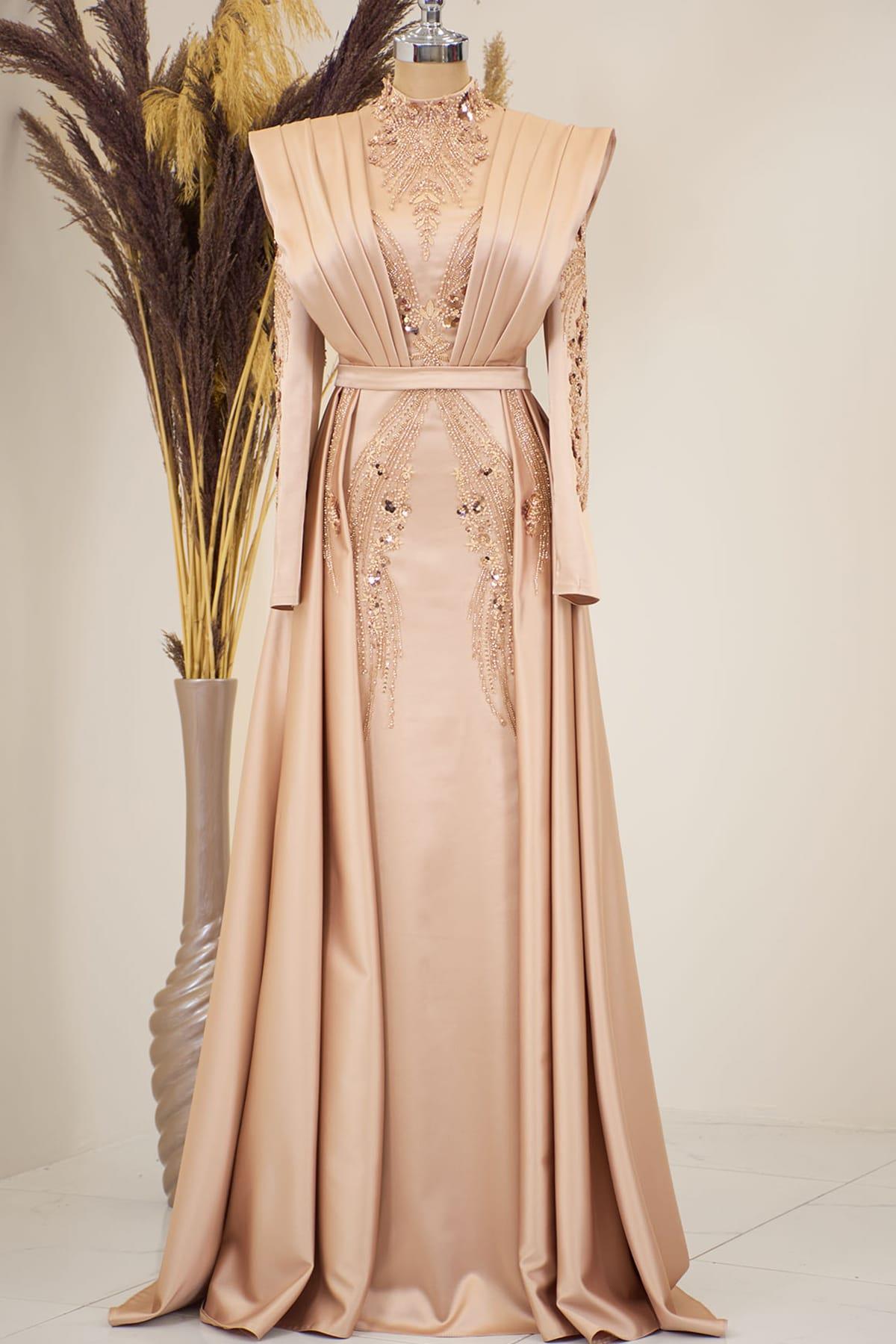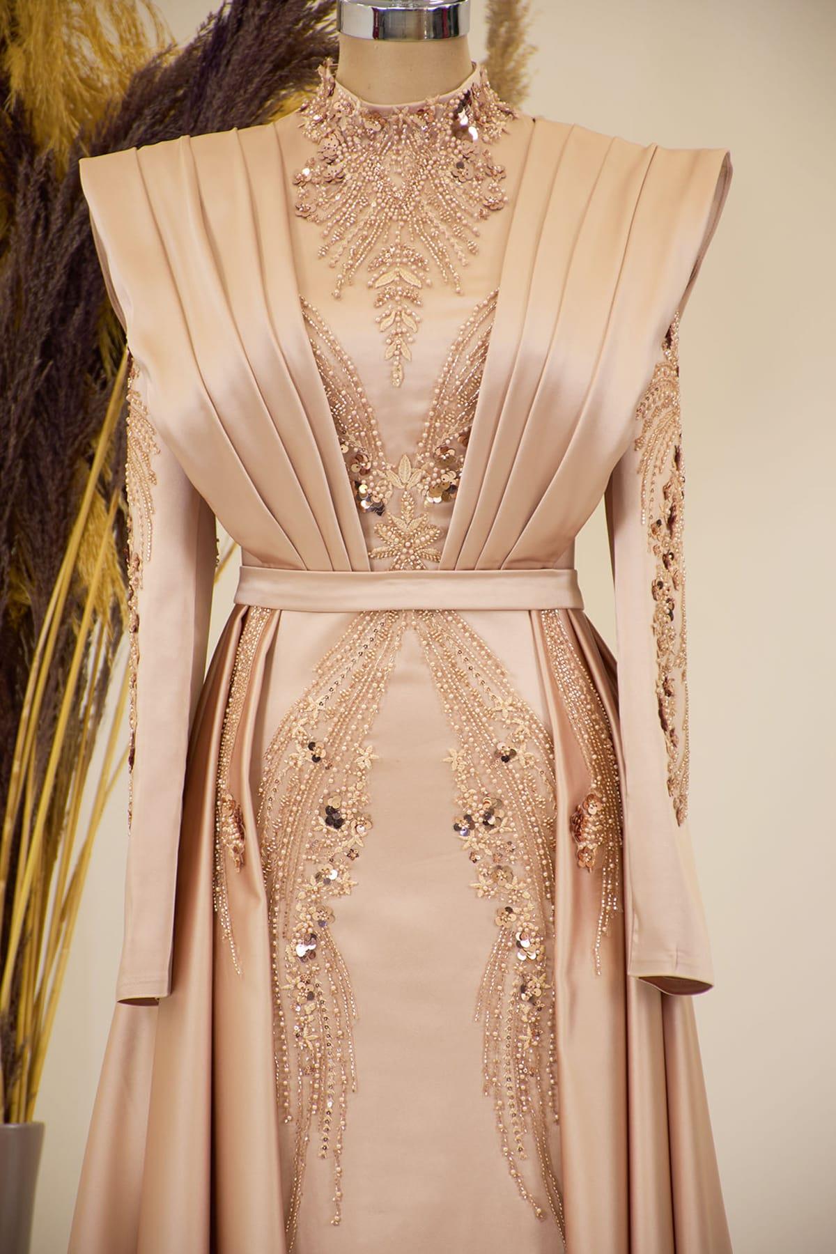 Önü Drapeli Kuyruklu Boncuk İşlemeli Miranda Tesettür Abiye Gold