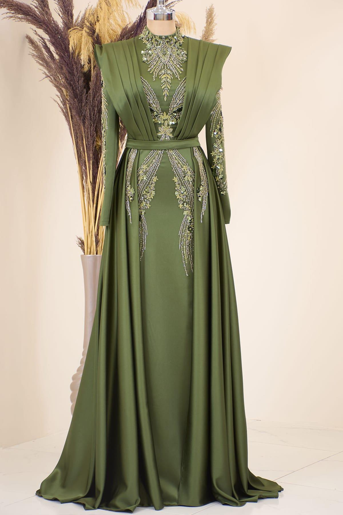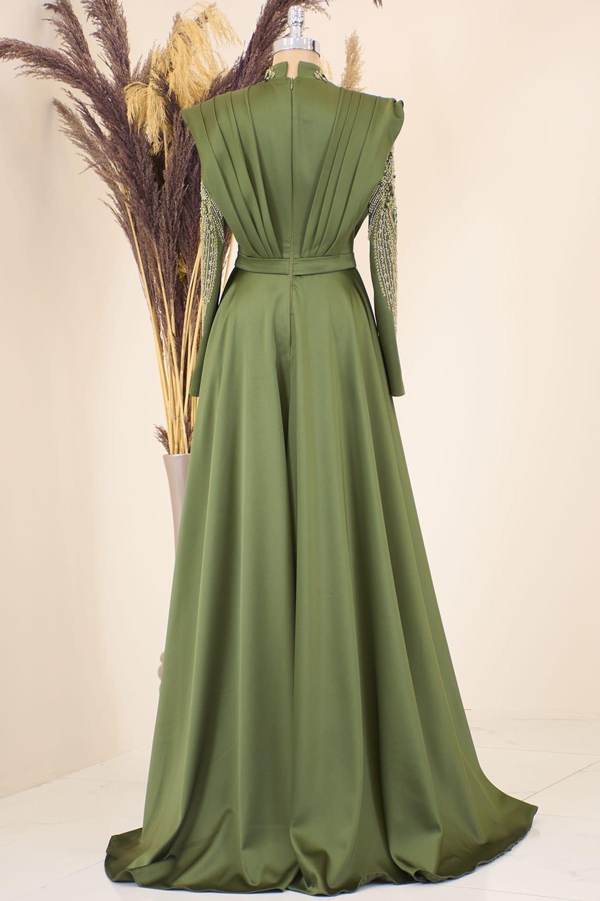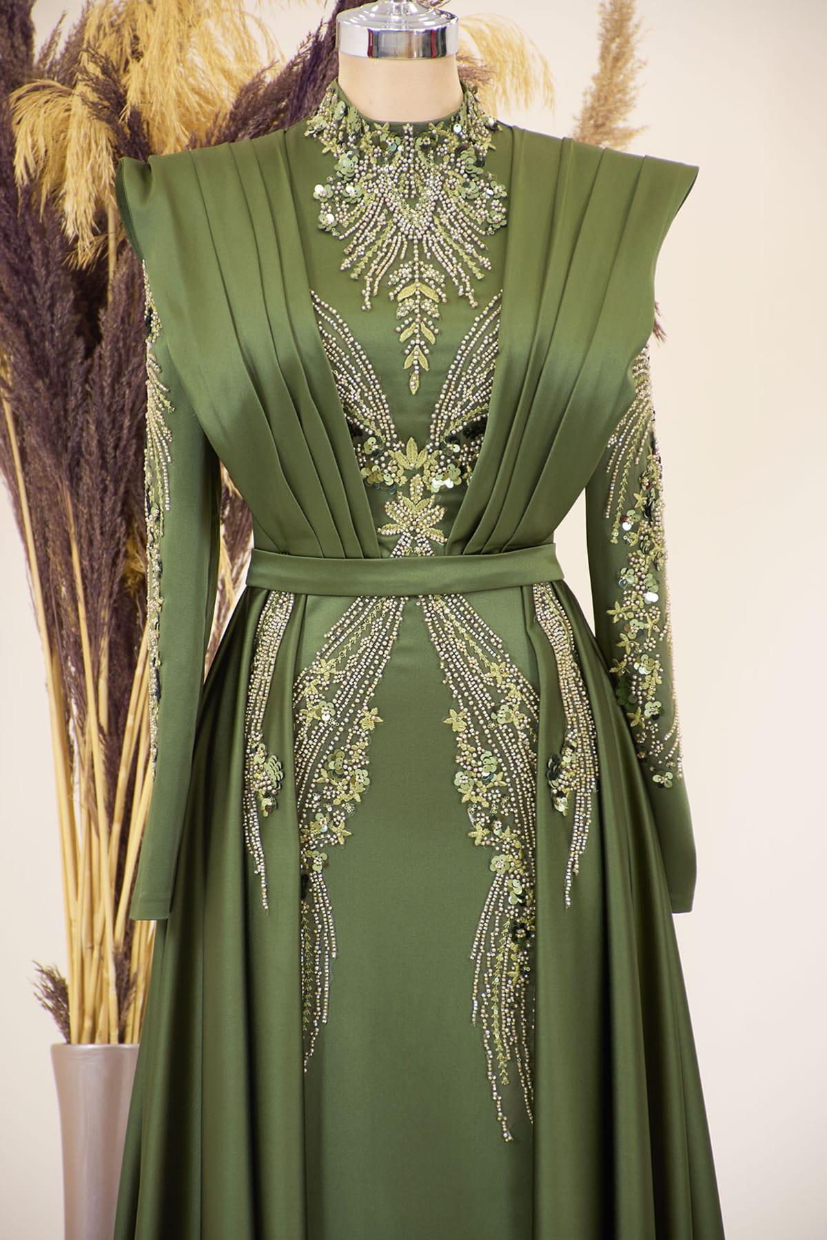 Önü Drapeli Kuyruklu Boncuk İşlemeli Miranda Tesettür Abiye Haki