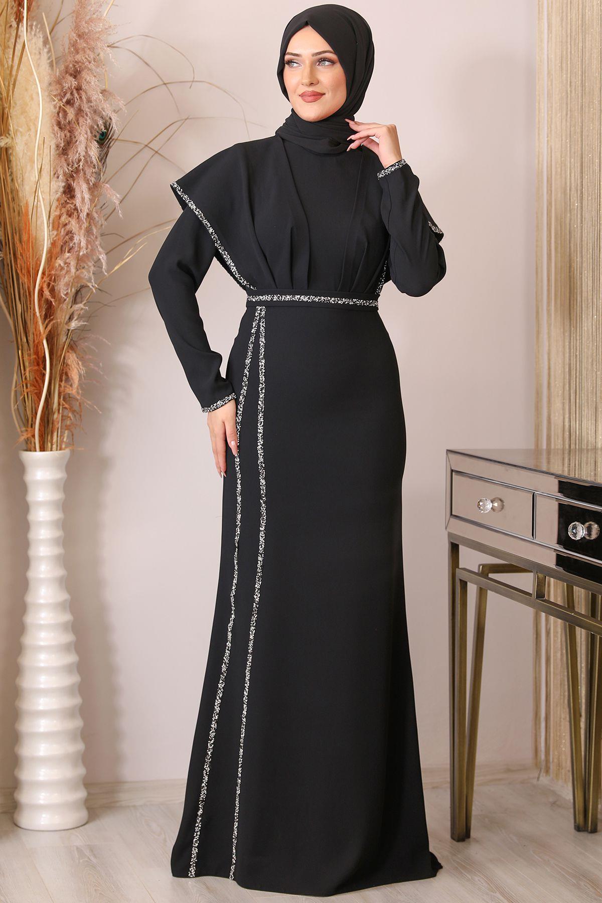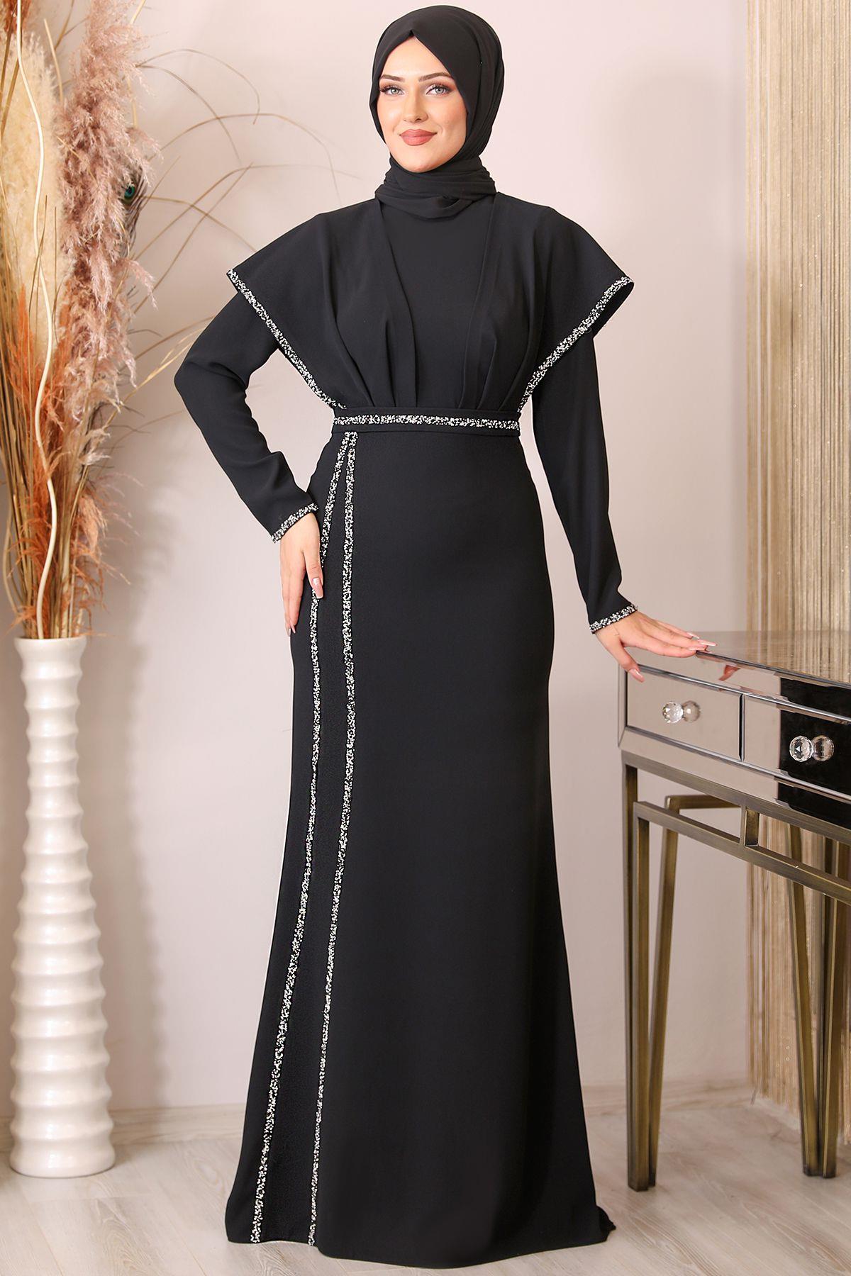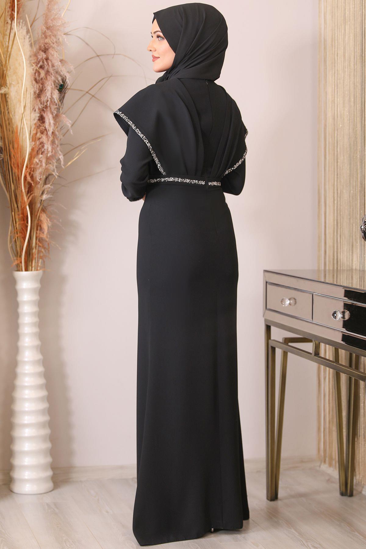 Peri Önü Taşlı Drapeli Tesettür Abiye Siyah