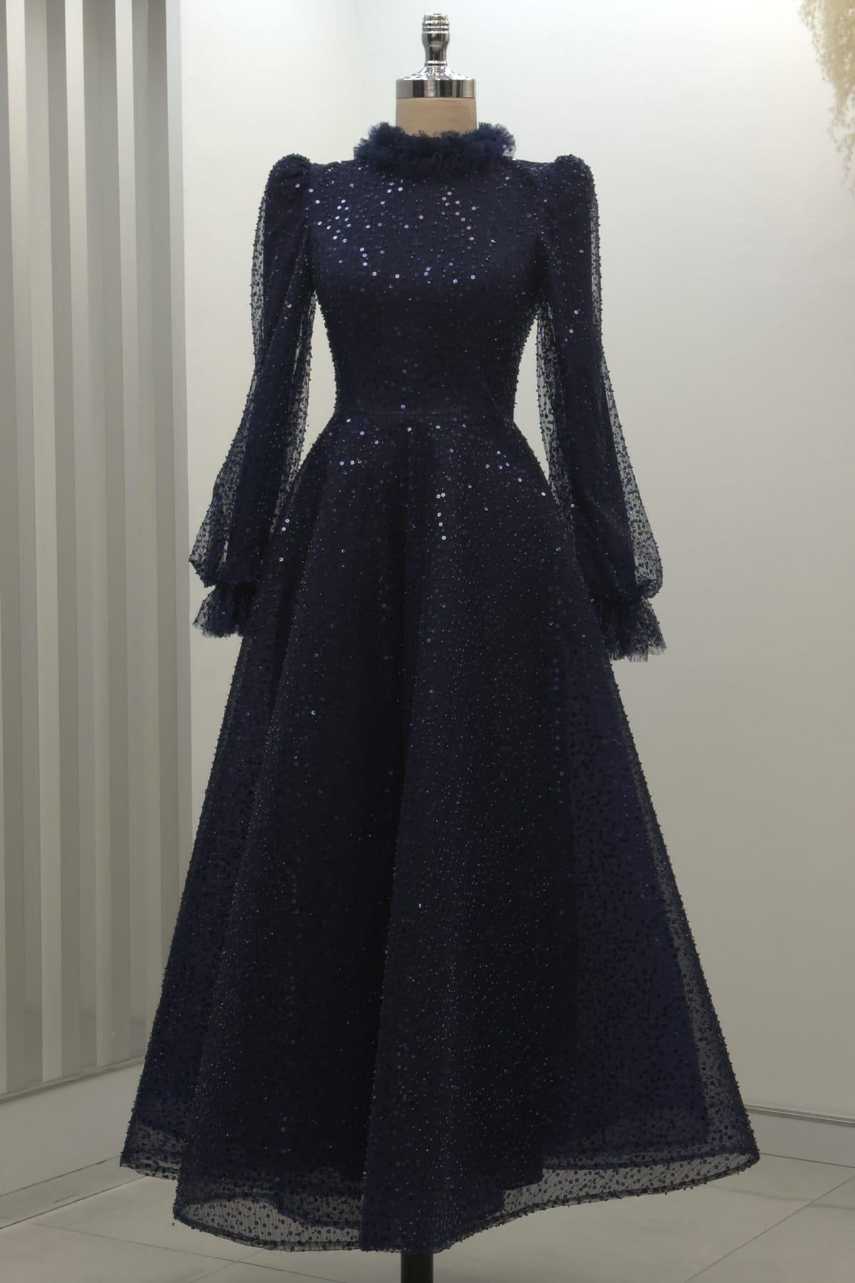 Pullu Kabarık Tesettür Abiye Lacivert