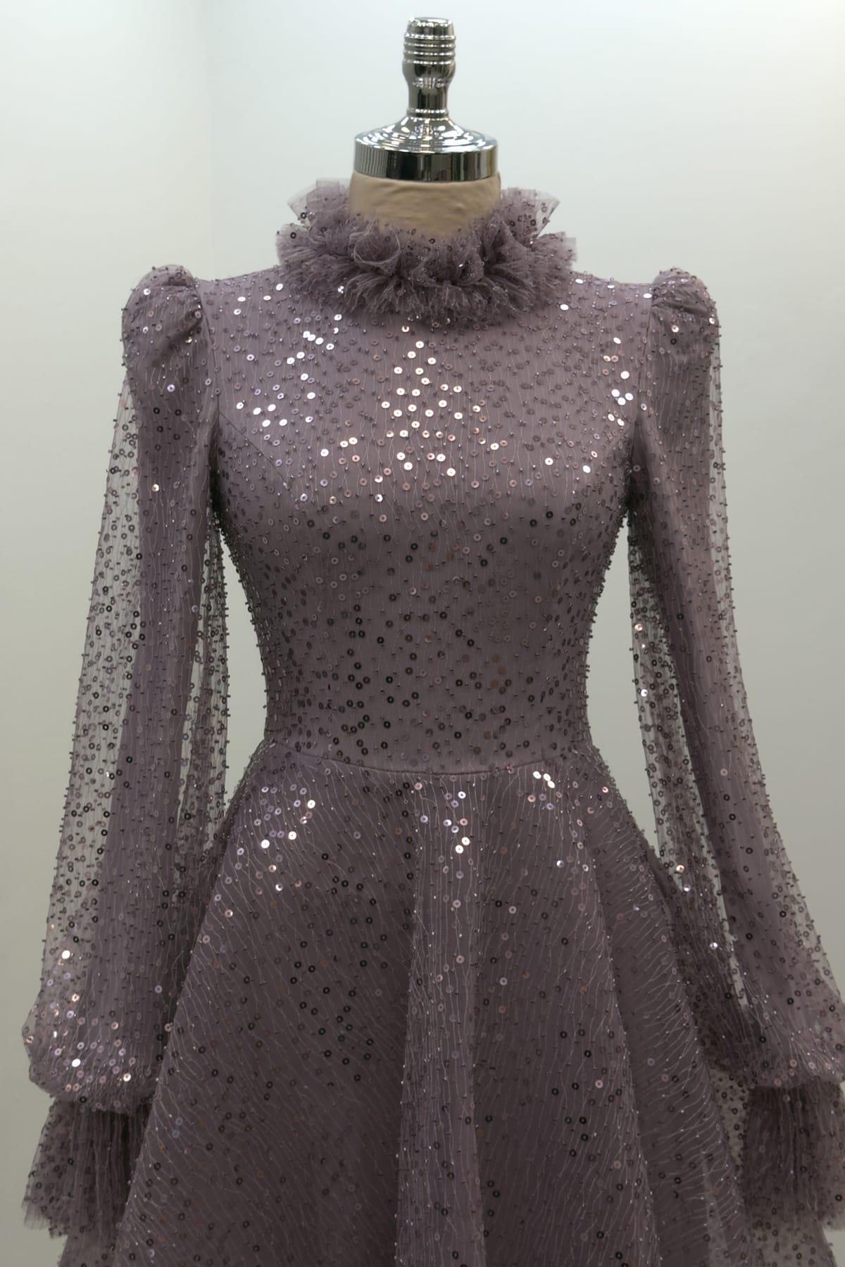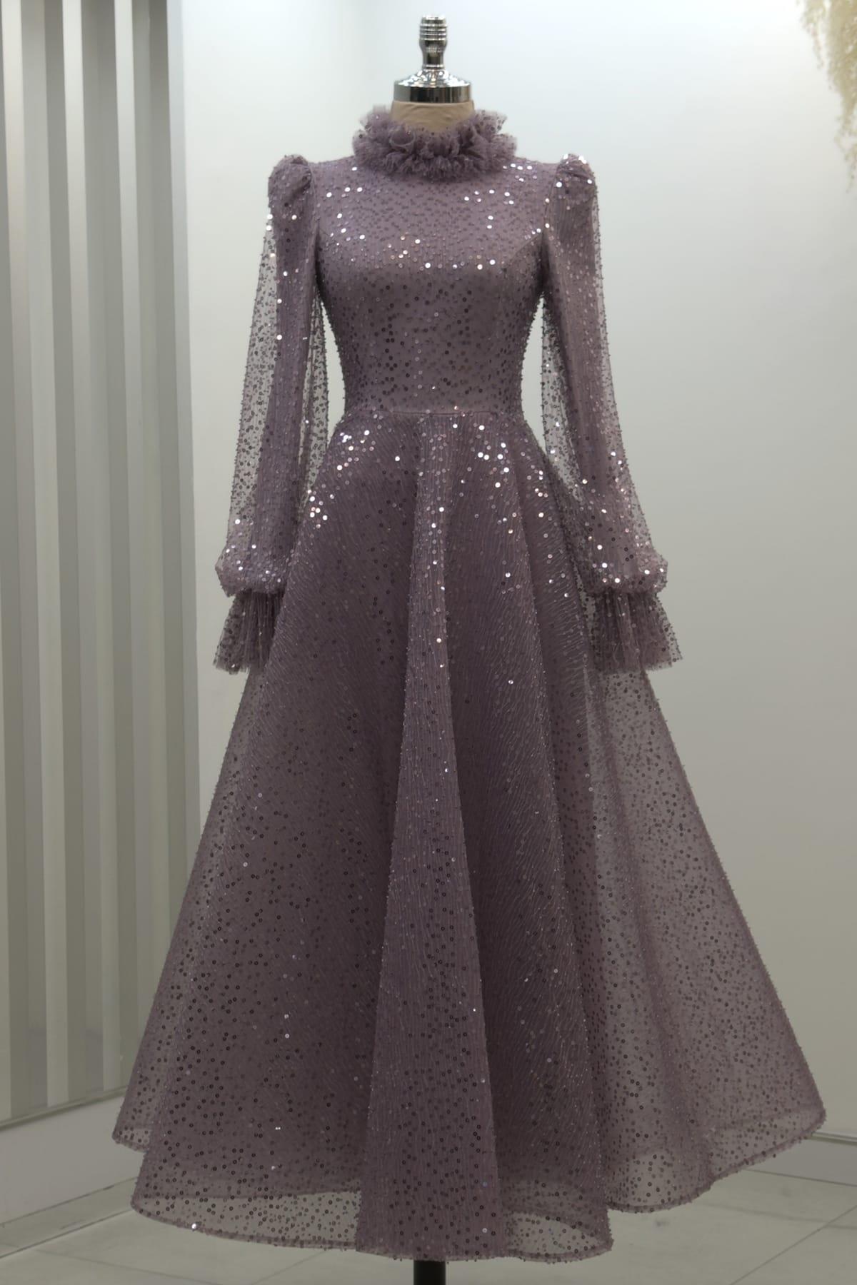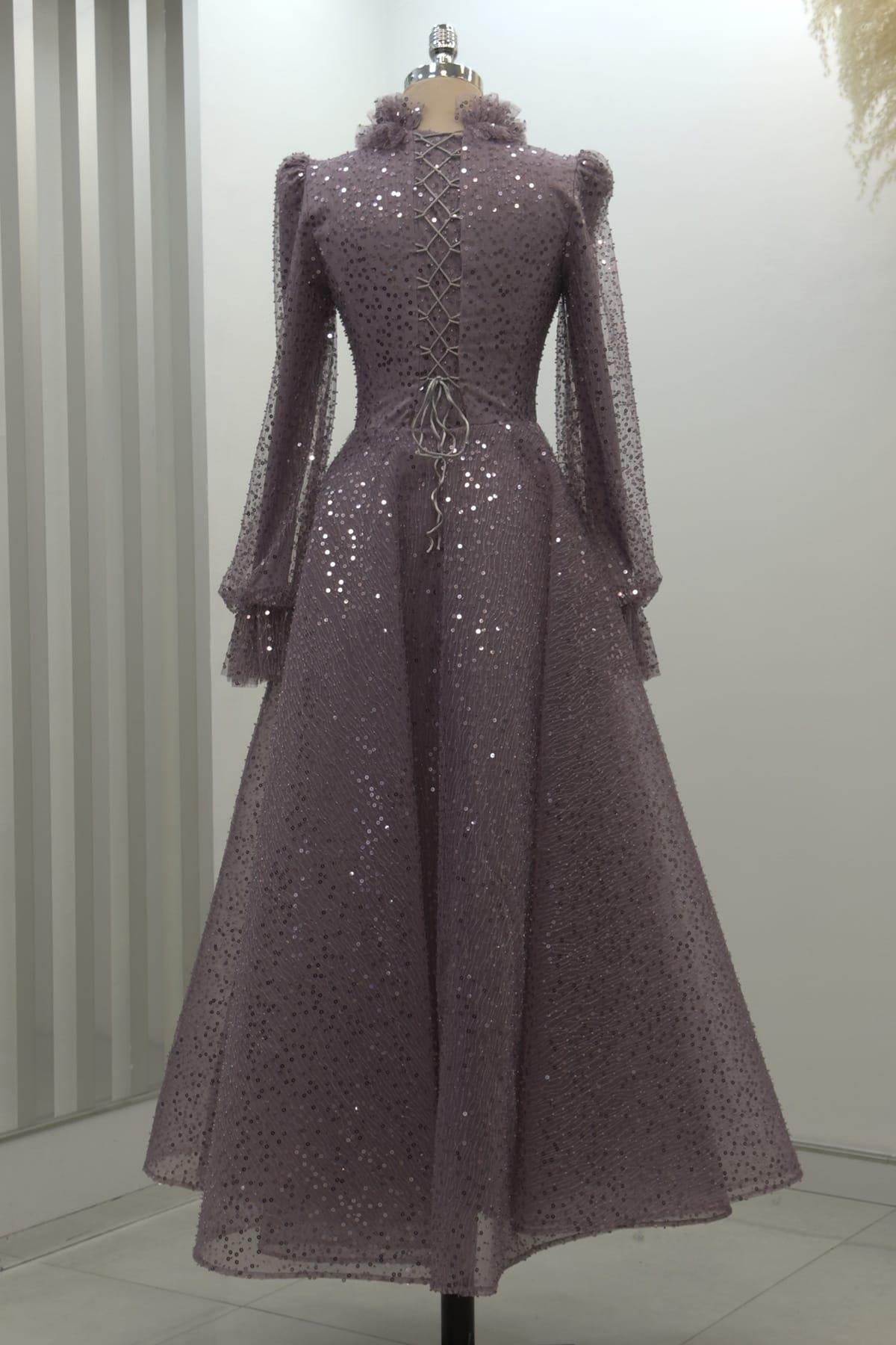 Pullu Kabarık Tesettür Abiye Lila